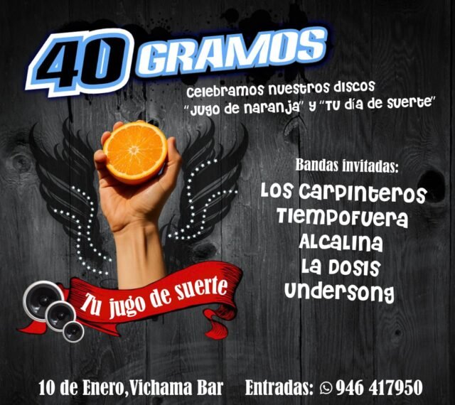La banda 40 gramos inicia el año celebrando el aniversario de sus discos más emblemáticos: Jugo de naranja (20 años) y Tú día de Suerte (15 años), junto a las bandas: Los Carpinteros, Tiempofuera, Alcalina, La Dosis y Undersong. Además, habrá músicos invitados.