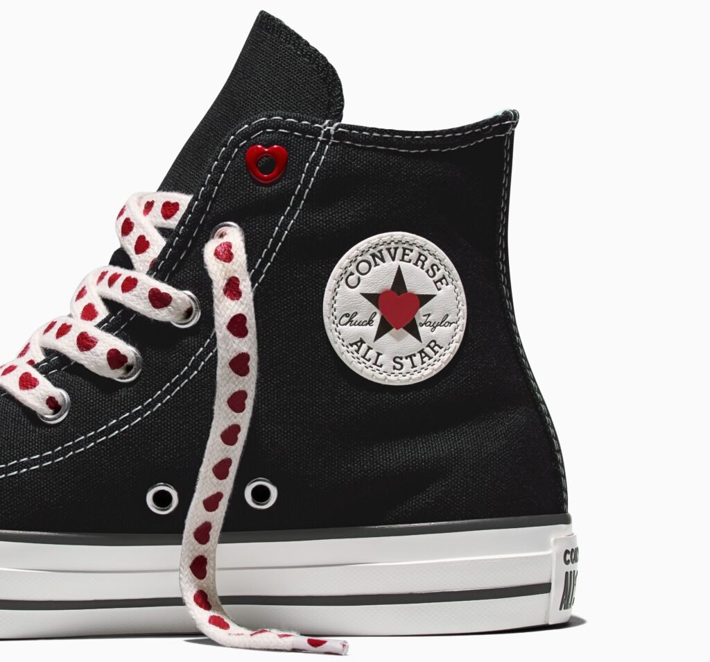 Aunque el ADN clásico de Chuck sigue siendo el núcleo de la gama, la colección añade una dosis extra de encanto con detalles en forma de corazón, divertidos adornos para los zapatos, costuras distintivas y estampados atrevidos y alegres, que aportan toques ingeniosos diseñados para despertar la alegría y permitir a quienes los llevan expresar su propia versión del amor.