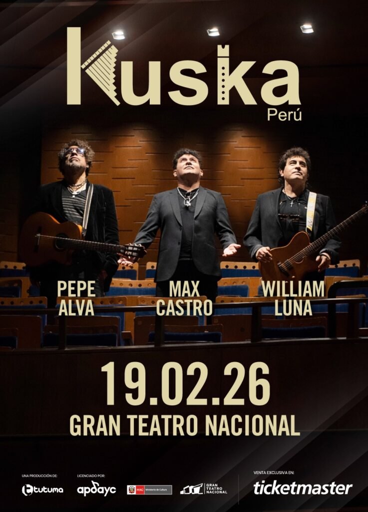 WILLIAM LUNA, MAX CASTRO Y PEPE ALVA se unen para dar vida nuevamente a KUSKA agrupación conformada por estos 3 genios de la música andina que ofrecerán un inolvidable concierto en el Gran Teatro Nacional de
