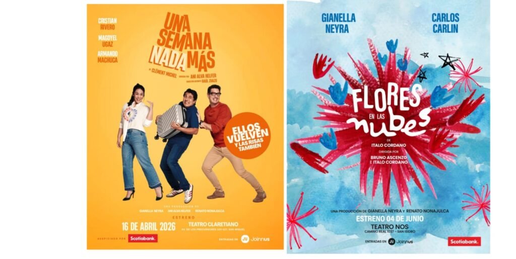 Luego se estrenará “Flores en las nubes”, bajo la dirección de Bruno Ascenzo e Italo Cordano, protagonizada por Gianella Neyra y Carlos Carlín, una comedia dramática acerca de las segundas oportunidades —del poder de empezar otra vez, de perdonar, soltar, y abrir espacio a lo que llega. Un relato que invita a mirar con humor las heridas, con ternura el pasado y con esperanza lo que aún se puede reconstruir. La puesta en escena llegará al Teatro NOS del 04 de junio al 05 de julio, con funciones de jueves a sábado a las 8:30 p.m. y domingos a las 7:00 p.m.