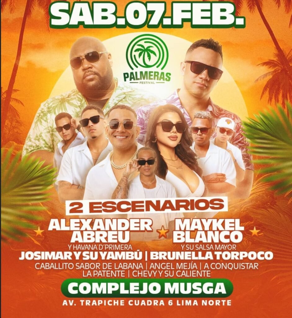 La salsa tiene una cita grande en la capital. Palmeras Festival presenta a dos de los más grandes salseros cubanos de la actualidad: Alexander Abreu y Maykel Blanco, quienes llegan a Lima para protagonizar dos noches consecutivas que prometen hacer historia, acompañados por artistas nacionales que completan una gran cartelera que te harán vivir una noche de salsa inolvidable.