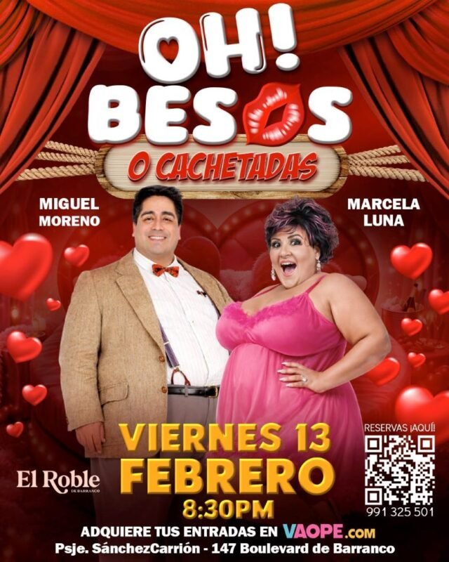San Valentín deja de ser cursi y se vuelve peligrosamente divertido. Llega “Oh! ¿Besos o cachetadas?”, un espectáculo de comedia, música e imitaciones con Miguel Moreno y Marcela Luna, diseñado para parejas reales, ex parejas, casi algo y valientes solteros que quieren reírse del amor sin filtros. Se realizará este viernes 13 de febrero a las 8:30 de la noche en El Roble, Boulevard de Barranco. Entradas a la venta en Vaope.com y reservas al 991 325 501.