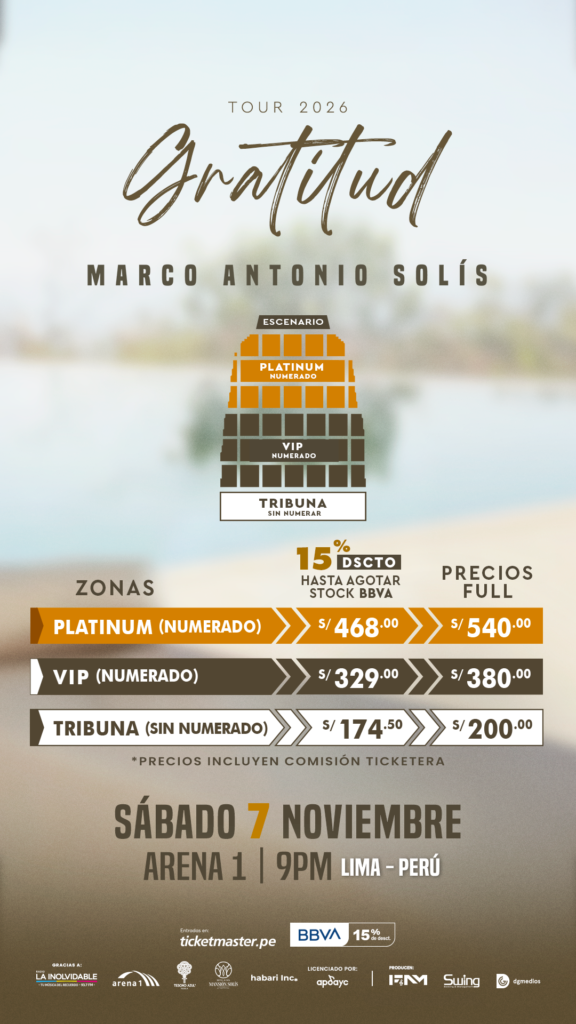 El esperado reencuentro entre Marco Antonio Solís y el público peruano ya tiene fecha confirmada. El querido cantautor mexicano regresará a Lima este sábado 7 de noviembre en el Arena 1, como parte de su gira mundial “Gratitud Tour 2026”, en una noche que promete estar llena de emoción, romanticismo y los grandes clásicos que han marcado a varias generaciones.