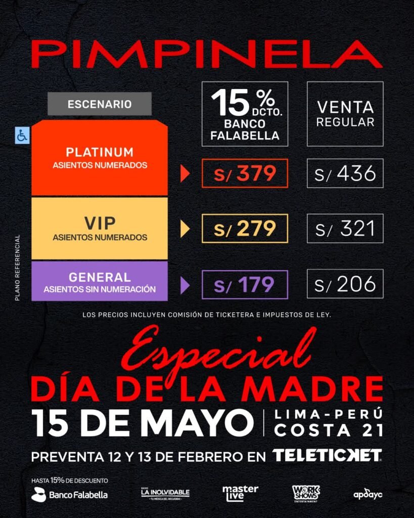 Las entradas para el concierto de Pimpinela en Lima estarán a la venta a través de la web de Teleticket. Habrá una preventa el 12 y 13 de febrero del 2026 con tarjetas del Banco Falabella y/o hasta agotar stock (capacidad