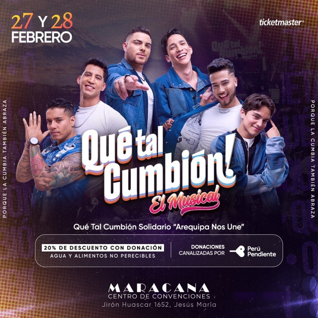 En un gesto que confirma que la música también puede ser un puente de esperanza, ¡Qué Tal Cumbión! anunció que sus funciones del viernes 27 y sábado 28 de febrero en el C.C. Maracaná se convertirán en jornadas solidarias a favor de las familias damnificadas por las intensas lluvias e inundaciones que afectan a la región de Arequipa. La agrupación, considerada la primera boy band de cumbia del país, reafirma así su compromiso en un momento de emergencia nacional.