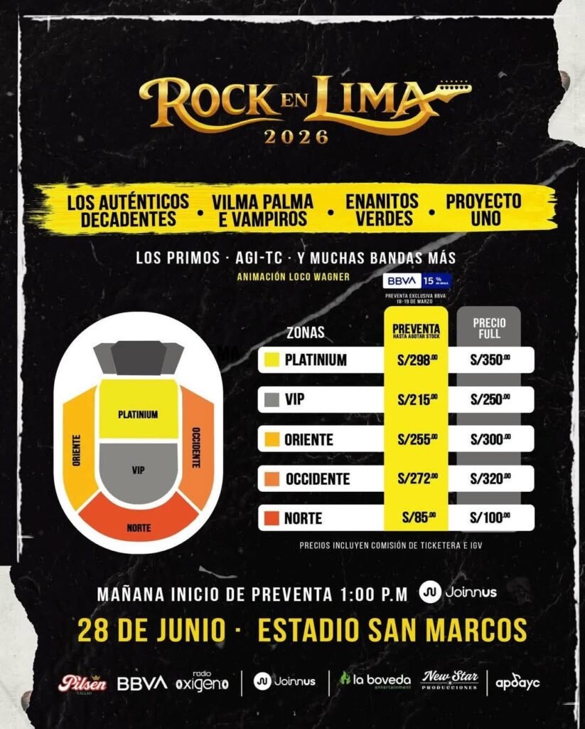 Los tickets para poder ser parte de esta gran noche en “Rock en Lima 2026” ya se encuentran disponibles en la plataforma digital de Joinnus con una pre-venta que aplica el 15% dcto con tarjetas BBVA hasta agotar stock.